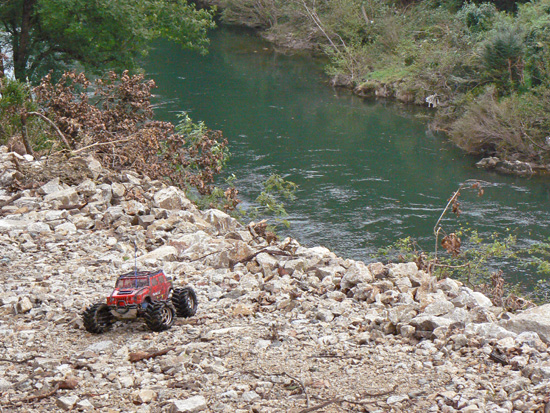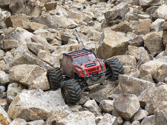 Se ve un poco diferente desde la altura de un Emax , a escasos 10 cm del suelo ? De repente una pequeña piedra delante del neumatico izquierdo ya no parece tan pequeña y el camino metros abajo parece un enorme laberinto de rocas. Si multiplicamos esto por 10 nos encontraríamos en un 4x4 a escala 1/1 que tendría que superar rocas de 70 cm de altura tiradas al azar sobre una pista de pendiente extremadamente pronunciada.