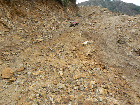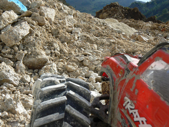 La pista que seguimos desde la entrada del tunel se encarama por la ladera sin contemplaciones, han limpiado roca y el unico objetivo de momento parece ganar lo mas rapidamente posible altura y quizas enlazar con otro tramo que se construya más adelante desde el Norte. Aqui todavia sube sin ningun problema el Emaxx. incluso en segunda si no nos preocupa gastar algo de bateria. El terreno tiene muy poca adherencia ya que hay muchos trozos de tierra fina y suelta que parece desmoronarse sólo con mirarla fijamente unos segundos. Es mejor mantener una subida alegre acelerando en segunda que arriesgarse a quedar derrapando "sur_place" en primera velocidad.