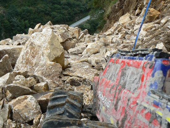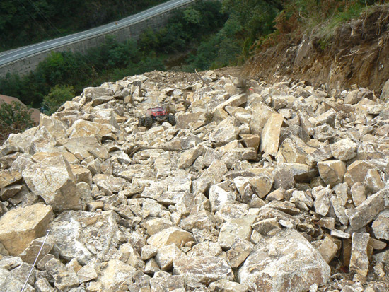 Buenisima esta trepada escalada por el carrizal antes de terminar la pista . Aqui hay pocas opciones, o subes o rompes un palier (CVD axle). Afortunadamente los palieres Mip e Integy de acero aguantan el paso y puedo completar la zona sin más que dedicarle algunos minutos de paciencia y atencion . Una pequeña parte de este tramo ha sido pisado ya por las orugas de la excavadora y está algo más facil de pasar pero hay tambien otras muchas en el que la piedra se encuentra tal y como ha caído de la ladera tras quebrar la roca. |