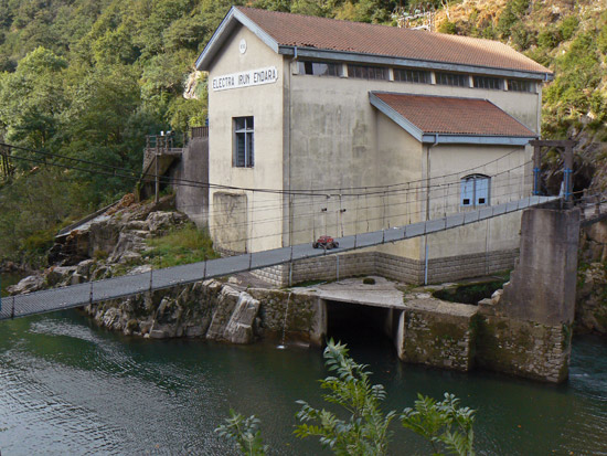 Imagen del Emaxx en mitad del puente colgante que comunica la N121A con la zona de servicios de la mini central. Es utilizado por los servicios de mantenimiento de la central hidroelectrica hoy totalmente automatizada de la empresa Irun-Endara . Una de las muchas y pequeñas compañias electricas que florecieron a finales del siglo XIX y que abastecían localmente a las poblaciones cercanas. Esta sigue en funcionamiento , puede producir 1275 KVA que vende a otra compañia de distribución. Puede cruzarse el puente y rodeando el pequeño edificio enlazar con la pista de tierra , antiguo ferrocarril y hoy via verde , de 27 Km que sigue al rio Bidasoa por su margen izquierda entre el puente de Endarlatsa y la poblacion de Santesteban |