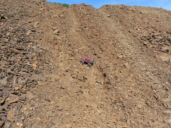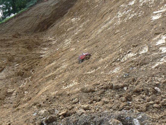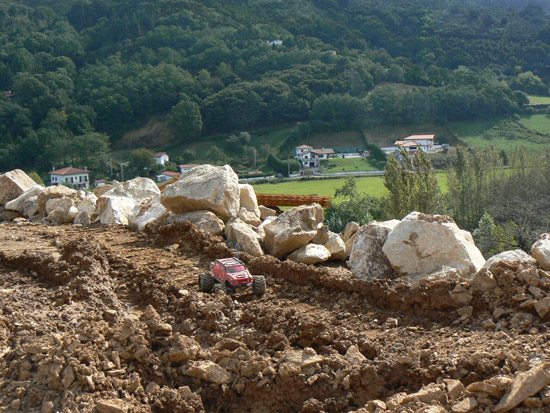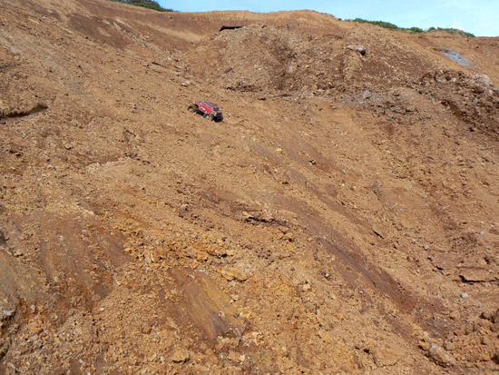 Termino con una de las subidas que se me atragantó, y tambien al Emaxx . Es la pendiente más brutal que he visto en estas obras por ahora , partiendo de una pista infernal ya con pendiente considerable arranca un atajo hecho por una ligera oruga excavadora al que asi a ojo le hecho casi 40º o 45 º de inclinacion en algunos resaltes para este mini coche. No tiene mas de 50 metros de longitud pero sube lo indecible y el terreno se cae a cachos el solo y nada más apoyar liegeramente una bota. Incluso cuesta de subir andando sin querer inclinarse mucho hacia adelante para apoyar la mano en el suelo . Mi Emaxx no pudo subir esta cuesta sin ayuda, justo antes del lugar en que se encuentra hay un pequeño resalte que lo hacia saltar y lo dejaba colocado en esta mala posicion , a punto de caer lateralmente y con muy poca adherencia para girar hacia arriba y reemprender la marcha. Habrá Emaxx con orugas en vez de ruedas?