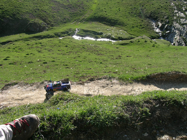 Un Baño. Este riachuelo nace en el llano de Sobrante de Linza, en la cabecera de este hermoso valle que vamos recorriendo . Deberemos vadearlo como podamos en el lugar menos profundo . De momento sera mejor no distraerse demasiado con él porque un palmo a la derecha del coche empieza el viaje a lo desconocido . Lo digo mas que nada porque no es facil imaginar cual de las partes en que se partiria el Emaxx llegaria mas abajo. Asi a ojo hay unos 80 metros de revolcon hasta el rio. A pesar de la experiencia en estas fotos siempre me da un repelus tocar la antena con la mano y / o dejar la emisora en el suelo, se que a veces se le cruzan las ondas para enviar señales suicidas al coche. Una de las variantes del camino, que antes comentaba, va por abajo, por donde el Emaxx, la otra un par de metros mas arriba la estoy siguiendo yo montado encima de estas viejas pero excelentes botas. Justo antes de atravesar el riachuelo llevaremos 35 minutos con el coche y sera necesario cambiar el primer pack de baterias. Estamos a 1600 metros de altitud, casi 300 de desnivel por Pack , algo mas de lo normal. Atravesarlo cerca de su nacimiento en una pradera encharcada no supone finalmente ningun problema, la parte mas profunda apenas llega al eje de ruedas , y con los nuevos rellenos de polietilieno burbujas en los Masher no se acumula agua. |