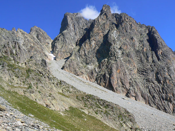 piedra suelta y las vetas de roca que lo cruzan.