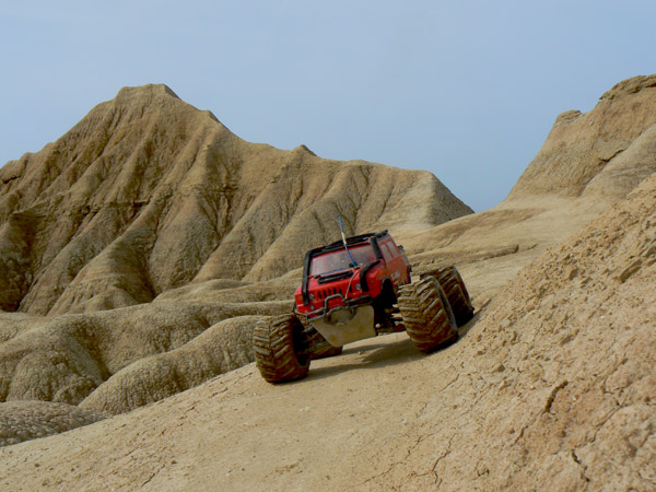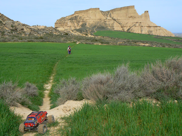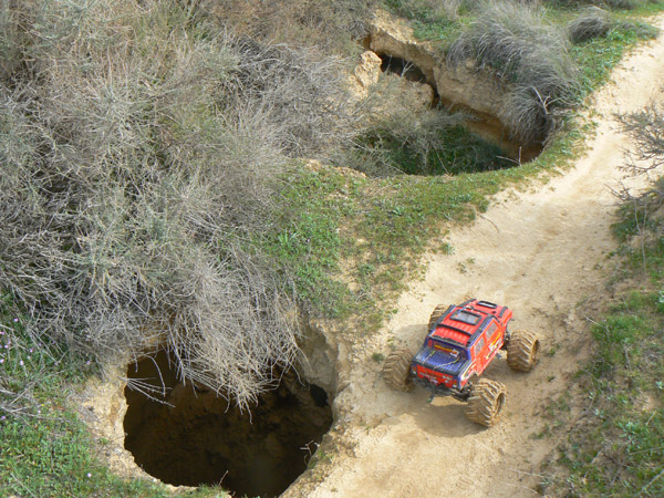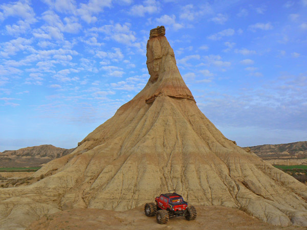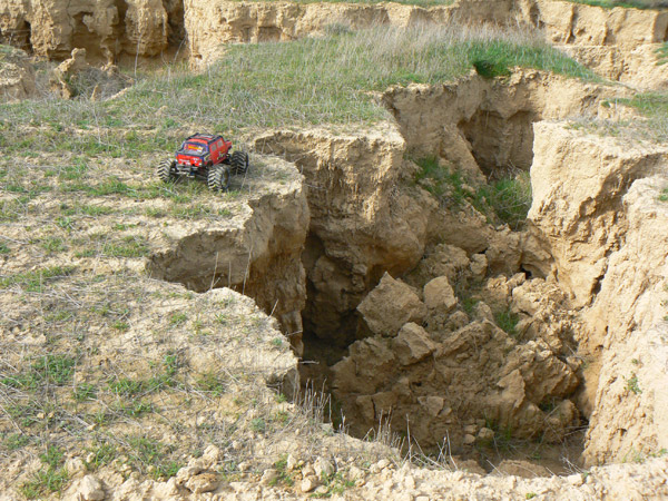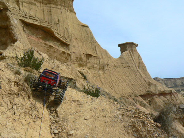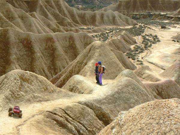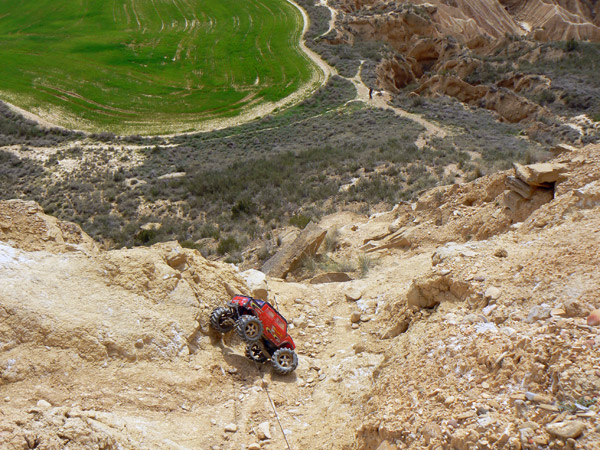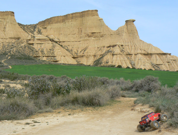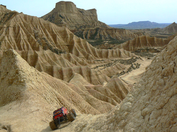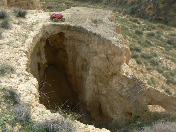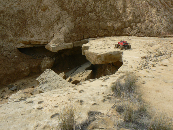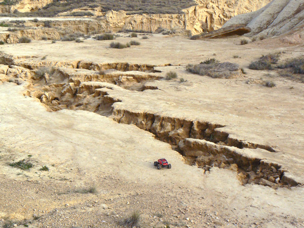 Alrededores de Castil de Tierra Es la primera parada, casi obligada, viniendo de Arguedas. Una de las estructuras más fotografiadas y quizás visitadas de las Bárdenas. A su alrededor una zona en franca erosión cerrada al publico, llena de grietas y hundimientos. En la imagen el EMaxx recorriendo una de las grietas, a modo de barrancos para su escala. Esta primera parte de le ruta la podemos llamar como de los agujeros ya que veremos muchos de ellos bajo nuestro pies. Para llegar al Barranco de los Cabrones, en donde iniciaremos la ruta, seguimos la pista de tierra principal, dejando siempre el polígono militar a nuestra derecha. Hay que andar con mapa detallado o GPS, toda esta zona tiene muy pocos o ningún indicador ni marca, algún hito de piedra aislado muy de vez en cuando. . |