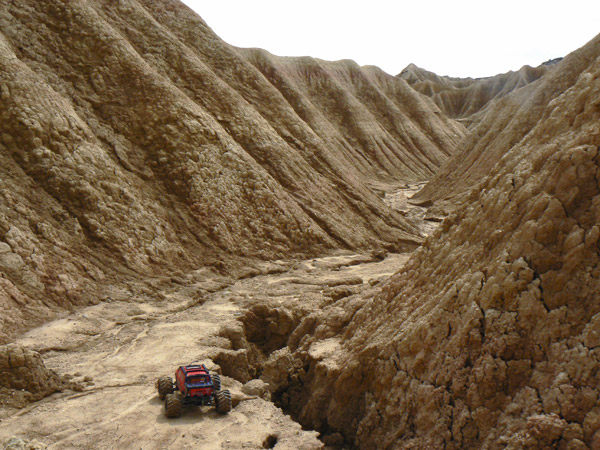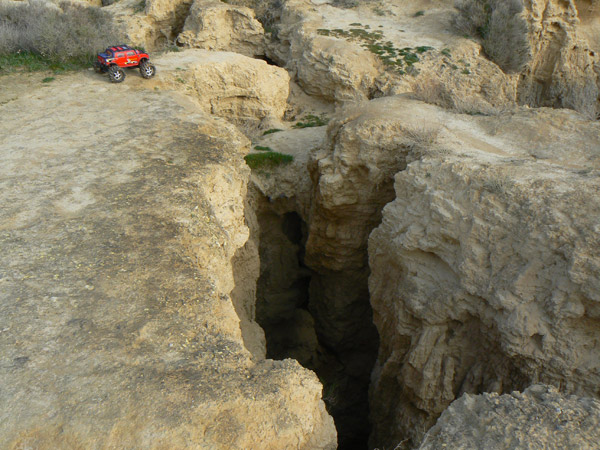 Por el minivalle. Casi como un valle a escala, en realidad un pequeño barranco que no me puedo resistir a seguir hasta que llega a una pared llena de desprendimientos en su base y que ya no me deja continuar. La grieta al lado del EMaxx es más honda de lo que parece en la imagen, en una parte de la grieta cabríamos el EMaxx y yo también, de pie.