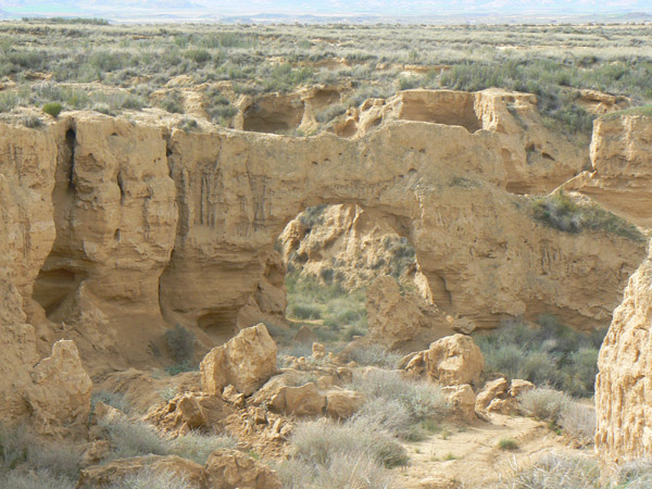 El camino nos lleva cerca de lugares espectaculares y vamos de sorpresa en sorpresa, puentes de piedra natural arcos enormes, cuevas, todo el suelo parece un despropósito de tierra. Las Bárdenas están mucho más verdes y húmedas de como las he conocido las seis veces anteriores, dos en bici, una en moto, una a pie y otras dos con el coche de radio control eléctrico. He gastado prácticamente un doble pack de baterías de 4000 Mah con la vueltas dadas a primera hora de la mañana buscando el sendero correcto. Ahora ando con una doble batería de 3600 y me quedan aun las dos de 4500 Mah Lipofe de 9,9 V, más o menos para unos16 Km de marcha. .