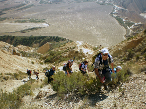 ----> Imagen perteneciente al grupo de montaña Peña Karria, de Vitoria ----> Link : http://www.karria.com/travesias.php?id=11&desc=Piskerra-(Bardenas-Reales) En la misma subida pongo, con permiso de Loli del grupo de montaña Peña Karria, una imagen de su excursión al Piskerra. Aparte de la subida, llama la atención el contraste en el color del campo de cultivo en la llanura en relacion a la anterior imagen. Nunca había visto las Bárdenas tan verdes y húmedas como en esta ocasión., la mayoría de los barrancos acumulaban aun lodo y algunos hilllos de agua.