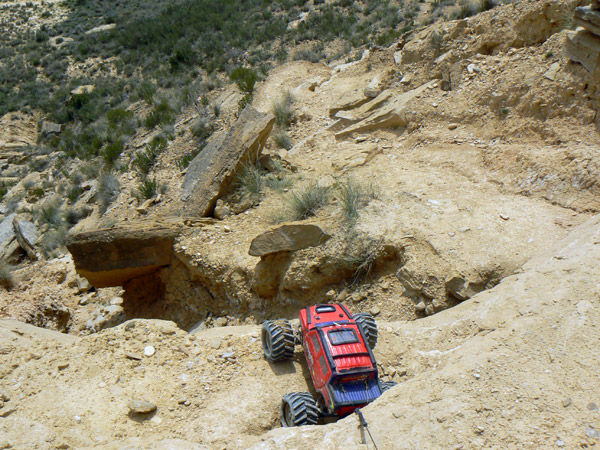 En el acceso. Quizás haya otro camino rodeando la mesta pero finalmente decidimos yo y familia meternos por la subida directa, la que parece más seguida desde esta pared nor. Oeste. Se empieza respirando hondo, poniendo primera y cambiado el ritmo de marcha Ya no es andar con el EMaxx en modo casi automático, a partir de aquí hay que prestar atención y preveer el recorrido un poco antes de meterse en el. Hay varios lugares en donde aseguraremos al EMaxx ya que pasa realmente justo. Además de un paso por un escalón de un metro de altura que no podremos hacer con el coche en el suelo y que quizás necesite apoyar una mano.