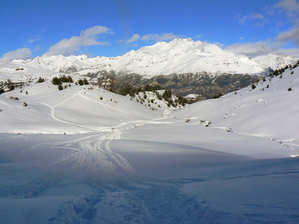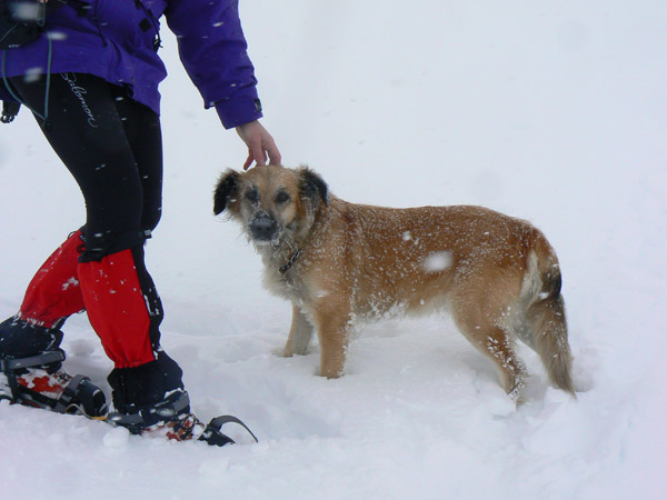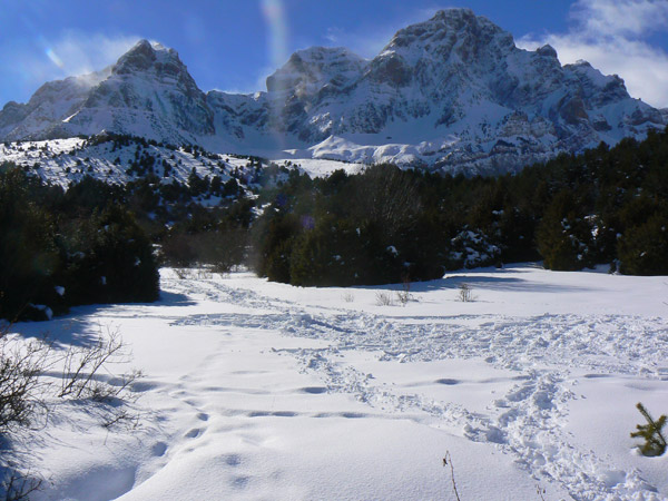 Nos encontramos con una nieve reciente muy seca y fria, con las raquetas hundiendose a veces hasta la rodilla y haciendo le paso realmente duro. aunque habia gente preparandose en el parking fuimos los primeros en salir y nos toco ir abriendo huella.