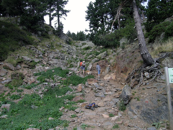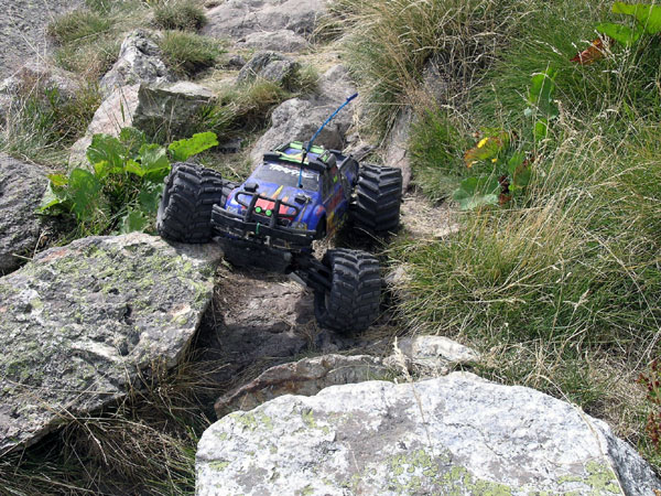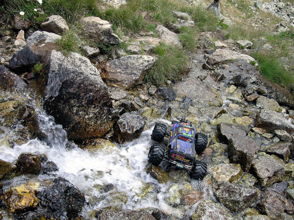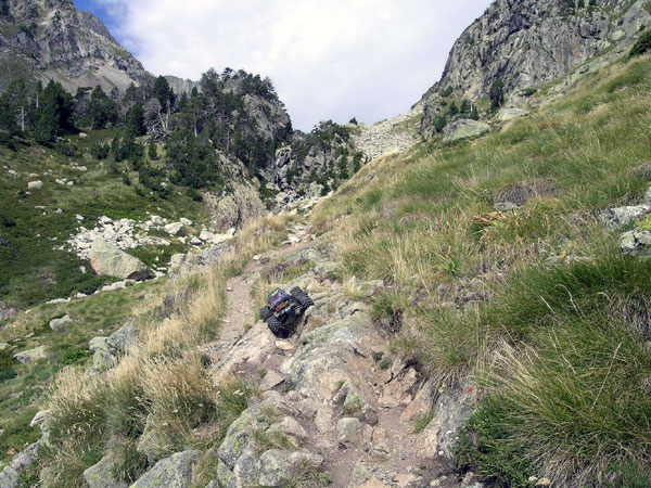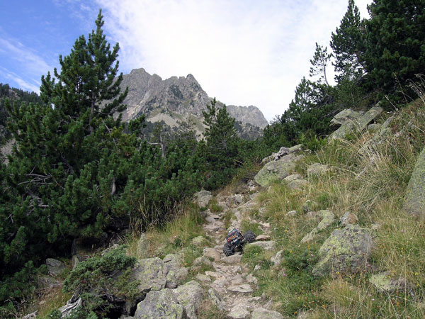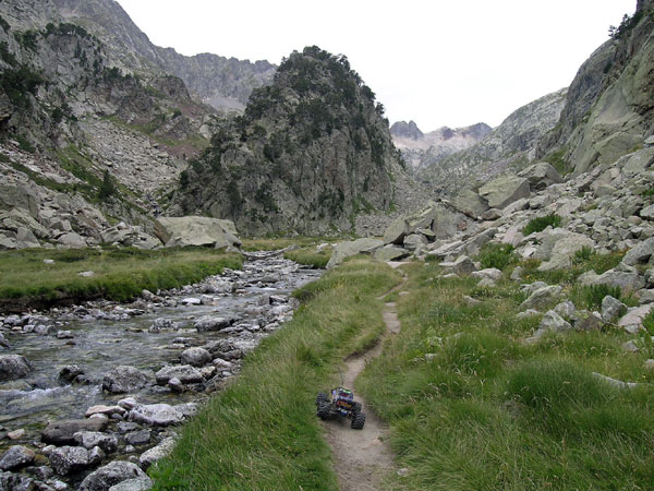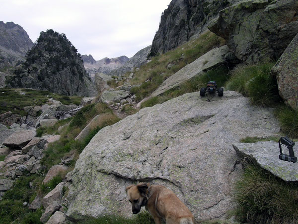 Terreno complicado. O piedra suelta o bloques enormes de roca o cantos agudos tamaño tetrabrik . Así es el 90% de esta ascensión. Excepto un primerisimo tramo que va entre el bosque y conserva un poco de tierra y prado alpino el resto es pura erosion, desmonte , tartera , roquedal. La ruta atraviesa varios cauces y escorrentias que se mezclan con el camino o que se lo llevan directamente por delante unos cuantas decenas de metros. Es extremadamente duro y lento . No exagero si digo que es un de los mas jodidos de estas 20 rutas que he hecho hasta la fecha y quizás deba plantearse de otra forma a como yo lo hice : subir, subir y intentar llegar a los ibones. Aquí hay que venir a trialear o hacer crawling, nada de paseos turísticos. Aquí se viene a destrozar el coche o no se viene . Son continuos los golpes en los bajos, los brazos de suspensión y el hacer tope el protector trasero de aluminio en los incontables escalones. Puedes romper casi todo. Pero es que me gusta , me excusaba ante mi mujer e hijo cuando tardaba un poco mas en llegar. .Por supuesto siempre iban por delante ,esperando pacientemente , y preguntandome cada 100 metros -¿Que tal vas...? Bien bieeen, voy tirando, decía mientras pensaba lo mal que iba y maldeciía cada piedra. Pues eso, todo piedra de todas las formas colores y tamaños , con o sin agua. Yo la única forma de salir de esto es llegar a la primera piedra y acelerar dejando que se pegue el Emaxx con la que menos le guste . Si ya llevaba el pobre Emaxx la carrocería tocada despues de esto tenia cortes en los laterales, en la falda posterior y golpes tan serios como para abollar el protector central de aluminio en su union con la parte trasera. |