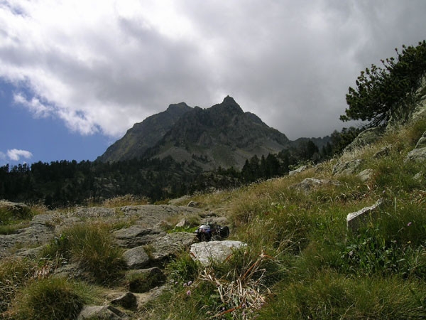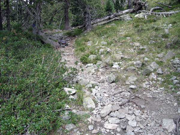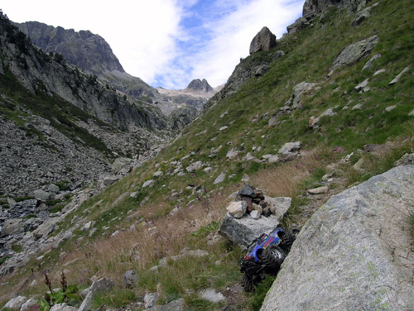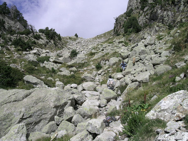 Aquí se pasa de piedras tamaño foca a rocas tamaño vaca. A alguien le quedaron fuerzas para colocar alguna roca en medio del valle y taponar algo mas el camino. No se porque extraña razón tiendo a pensar que los caminos chungos terminaran poniendose fáciles, que nada malo puede durar mucho. Pero ese optimismo desaparece rapidamente al llegar aquí. El arroyo parece calmar un poco sus ansias por despeñarse montaña abajo y su prisa por aportar el caudal al río Ésera . Durante unos poquísimos y esperanzadores metros se pisa hierba, auténtica hierba crecida de agosto al lado de un apacible curso de agua fresquísima y muy limpia. Mas adelante no conviene mirar.