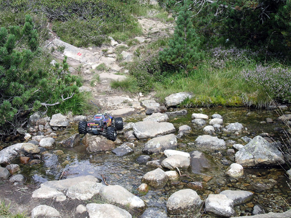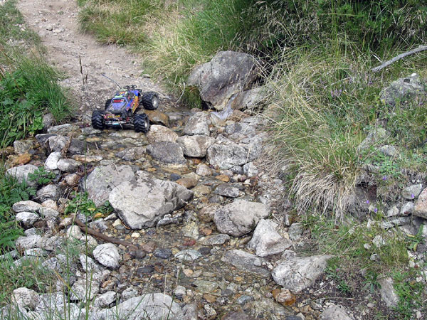 Otro.. Venga uno mas, que siempre me han gustado las zonas de agua. Las dos marcas rojas en el camino deben ser para que el agua no se pierda y sepa por donde continuar . No hay lugar a dudas si va el agua voy yo , es por aquí. De momento ninguno de los muchos arroyos que hemos cruzado, llevaba un caudal suficiente para remojar el emaxx mas arriba de la salida del servo de dirección, punto en el que me empieza a parecer delicado seguir sin helicóptero de apoyo.. Desde que puse los brazos RPM con rodamientos mas robustos y sellados con teflon no he tenido ni un solo problema con ellos. Antes con los originales debía de cambiarlos o aceitarlos cada cierto tiempo aunque también hay que ver que eso fue en invierno cuando me metía a saco en la nieve la lluvia o el barro. En el mes de Abril o Mayo en pleno deshielo y con algo de nieve la cosa estaría sin duda mucho mas complicada, quizás imposible de vadear con el coche.