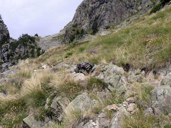 Y que diablos es esa pendiente al fondo del valle? rocas tamaño foca ! Bueno, puesto a inclinar no viene de un poco mas verdad?, a estas alturas ya conozco bastante bien hasta donde llega un Emaxx antes de volcar lateralmente y perderse ladera abajo. Aun así hay algún paso que hacemos a la par, el Emaxx en lado montaña y yo en el lado valle. Desde aquí descubro un amontonamiento increíble de rocas tamaño foca al fondo del valle , como taponando toda salida decente. Empiezo a pensar seriamente que este no es lugar para un Emaxx. pero sigo. - Bien bieeeen, tirar p´alante que ya subooo. |