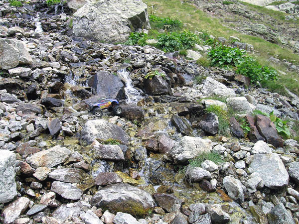 Nos habíamos apuntado a descenso de barrancos o a hydrospeed ?. El camino es eso, no hay mas que seguir todo el rato al agua cuesta arriba Este sitio da para entretenerse bastante tiempo mirando el agua las piedras y el coche, el agua las piedras y el coche. Una y otra vez hasta que no le encuentras ningún sentido y aprietas el mando de la emisora resignado. Que me gusta ya lo se. Me encanta. Hay aquí bastante agua como para no jugarnos el variador intentando vadear por el centro, mejor seguir un par de metros rectos e intentar hacia arriba cerca del borde de hierba, aunque haya mas piedra. |
