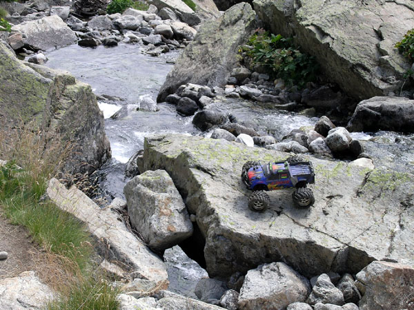 Yo de ti no lo haría.. El emaxx esta como a la espera de coger impulso y dar un salto hasta el camino. Esta en una roca a dos metros de altura sobre el agua . El momento mas inoportuno para un desvaríe de la emisora o receptor. Afortunadamente aguanta bien durante la foto y luego tengo que bajar a por el. No pienso que merezca la pena arriesgar el coche en un salto de esos |
