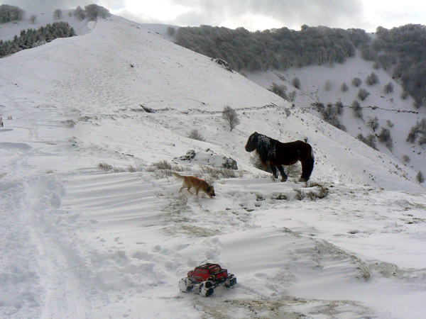 Ruta 90. San Donato Primera prueba doble motor Integy 45T. Cambio de motores. O lo que es casi lo mismo ,de coche. Hace tiempo que quería conseguir mayor autonomía , las rutas cada vez más largas y el rápido deterioro de las baterías Nimh me hicieron pensar en algún cambio. Por una parte, no hace falta tanto motor como los dos Titán a 14,4 V que lleva de fábrica para hacer senderismo y media montaña. Puede hacerse pero a base de consumir mucho, dos titan en este terreno son demasiado potentes. Podemos subir con un Hummer o con un Samurai, pero no vamos a consumir lo mismo, inluso si vamos al misma velocidad, Los Integy 45T son motores con menos potencia, menos consumo y que funcionando a menos RPM dan un par mayor que los originales. Estos motores necesitan entre 6 yu 12 V para funcionar, de forma que con 8 celdas NiMh en serie, 3 Lipofe o Lipo debería ser adecuado. Andaré hoy por estos montes contando con la compañía de mi mujer , mis dos hijos , y también nuestra perra Lyra. Vamos a encontrar MUCHO barro en la primera parte del recorrido y sin ninguna duda el Emaxx va a ir por delante y mucho mejor que nosotros