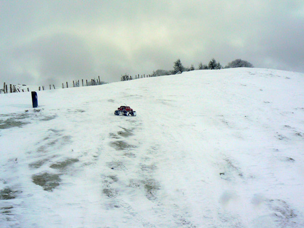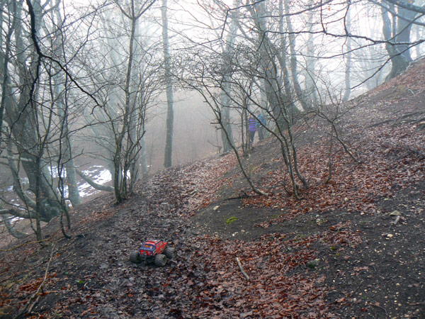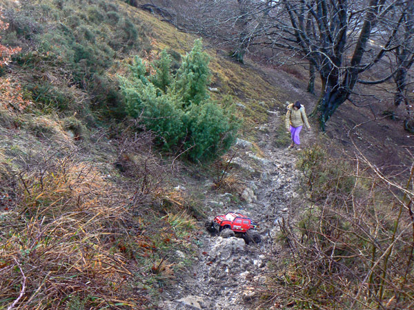 Incluso a 9,9 V son motores sin nervio, se acabaron las derrapadas y acelerones que soltaban los motores originales al menor toque de gatillo. Esto es un tractor, con un enorme motor diesel a muy bajas revoluciones y funcionando con una suavidad que solo un motor eléctrico con escobillas puede dar. Así que si alguien quiere montarlos primera tiene que mentalizarse un poco del cambio de coche, esto no sirve para saltar, ni para acelerar, solo para subir en cualquier velocidad por cualquier camino. Con la relación de transmisión 12/72 y 9,9 V queda la primera velocidad a tope un poco por debajo del paso normal de 5 Km./h lo cual esta muy bien para senderos complicados o con mucha piedra. En llano , incluso en senderos con fuerte subida pero sin muchos obstáculos podemos andar en 2ª velocidad entre 1 y 10 Km. por hora, prácticamente con una curva de par constante . Hay que aprender una cosa con estos motores y el emaxx, no hay que acelerar ni coger inercia para pasar , no importa cuan pillado este un neumático en unas rocas, o parte el palier o pasa. Estamos en el primer kilómetro de la ruta, una fuerte subida por el bosque. |