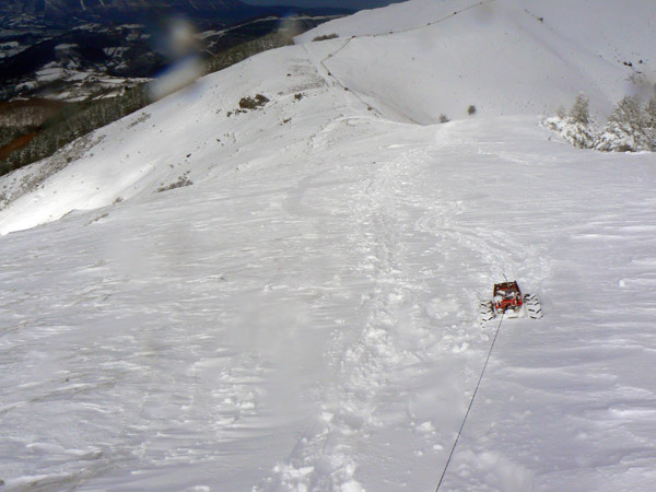 La Ladera II Solo un poco más arriba , un grupo de montañeros desperdigados por la ladera nos muestra el camino, la verdad es que desde aquí se ve muy larga, pero paso a paso iremos subiendo y casi sin darnos cuenta estaremos en ele último tercio, Aseguro el emaxx con la cinta extensible atada a mi cinturón porque un pequeño levantamiento del tren delantero o un vuelque lateral seguido de caída es totalmente imparable . La nieve esta no vale para subir, esta fundente y no agarra nada de nada. Mucho mejor evitar estas pequeñas placas de nieve ay andar directos por la variante de piedras un poco a la derecha, es más abrupta y tiene más pendiente pero mejor que andar patinando en el cada placa. |