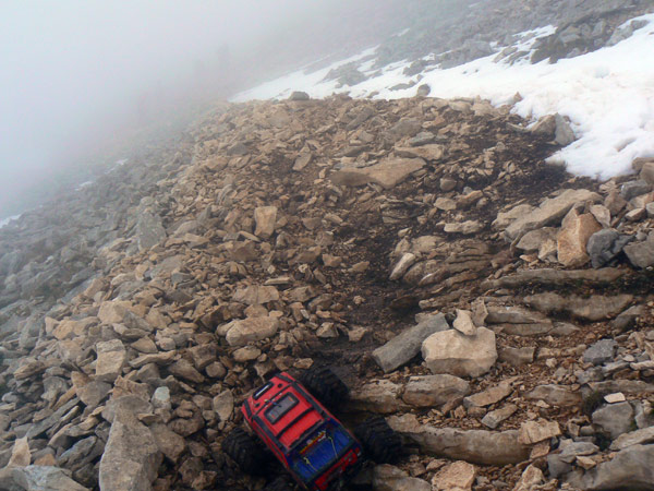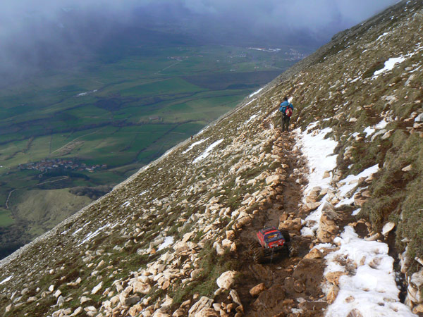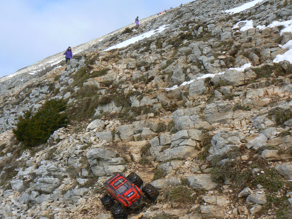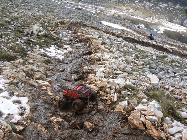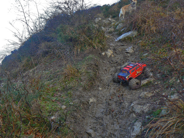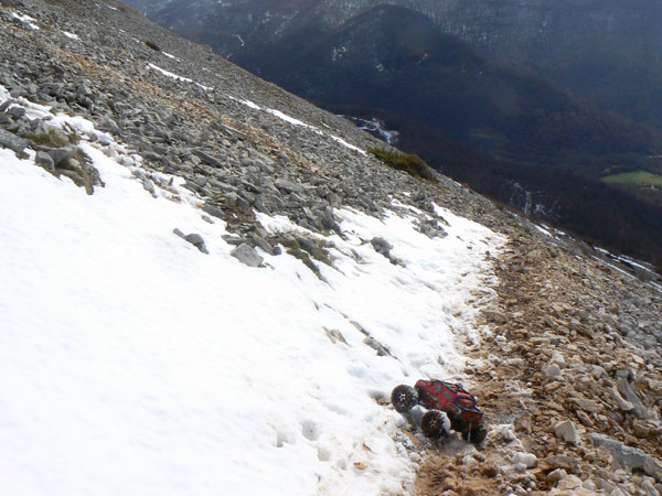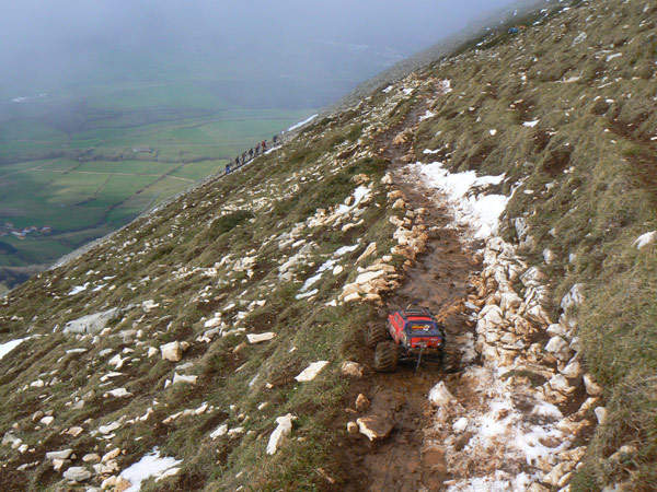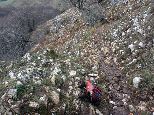 final del bosque Voy aun con la primera batería de 4500 en el coche y quizás llevemos una hora andando entre paradas, patinazos y fotos. En estos tramos hay que andar muy concentrado y ni siquiera me doy cuenta de cuando me sacan esta foto . Hay mucha caída abajo hacia el valle , y estos próximos metros van a requerir algo más que habilidad para pasarlos. La docilidad y suavidad de estos 45T es increíble, da igual andar en 1ª o en 2ª. Salvo por el detalle -grave- de que no retienen al frenar con la emisora me están pareciendo ideales para estos recorridos. Quizás con un variador electrónico con freno programable podría mejorarse