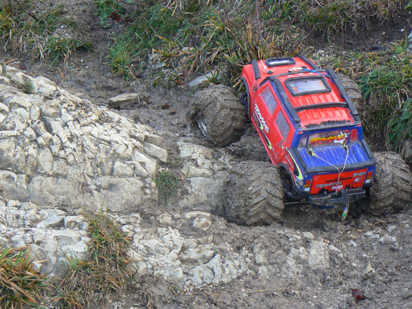 Mas barro Si he encontrado un lugar donde el barro fueses más deslizante y pegajoso que en el resto es este, fijaros como va la llanta trasera izquierda. Estos neumáticos en V son excepcionales en este terreno, nada puede superar este sencillo dibujo. Ha subido el coche por tramos con dos cm de barro que se nos pegaban a las botas y nos impedía caminar . Mucho mejor el coche que nuestros pies en este terreno. El camino además de barro contaba con cacas de caballo sobre las cuales habían dejado también su recuerdo las vacas y finalmente habían pisado con sus pezuñas dejando un camuflaje sobre el sendero difícil de distinguir. Probamos también por primera vez en el monte unas baterías con la tecnología Lipofe, la cuarta generación de baterías que he conocido desde que estoy en este hobby. NiCd, NiMh, Lipo y finalmente estas. Su principal característica es que pueden aguantar hasta 1000 ciclos de carga y descarga, que puede ser cargadas a 5C , lo que equivale a meterles 20 A en carga o pasar de 0 a tope de carga en 15 minutos. Algo que de todas formas no voy a probar,