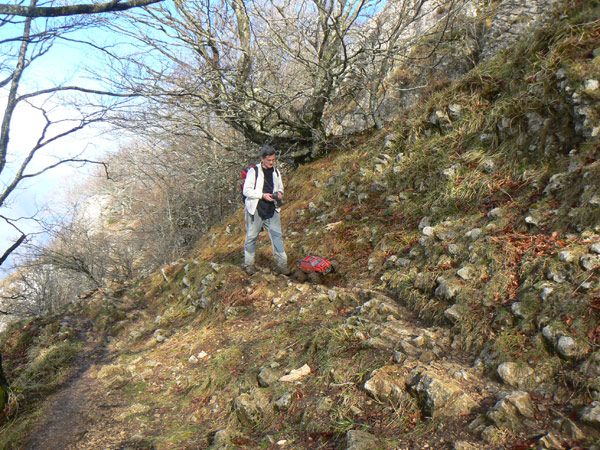 Antes de comer Ultima imagen de esta ruta, dejando la ladera para buscar en el bosque un lugar más protegido del viento. La verdad es que a -2 ºC que debía haber en esta parte no es que fuera un abrigo muy confortable, el sudor se me helaba en la espalda y esta vez, si me importaba. Comeríamos todas las provisiones un poco más adelante , cerca de un monumento que hay e el bosque, una especie de menhir pequeño.