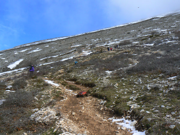 La escalera. Desde esta foto se ve perfectamente el peor tramo de la ruta. Una parte, puesto que es más largo que lo que vemos. En este punto , a la subida, hay que calzarse el coche a cuestas y subirlo a empujones casi. Hay altura as que suficiente para volcar hacia atrás y el grip no es tan bueno como para probar una subida crawler. La primera es mi hija, un poco más arriba mi mujer y mucho más alto la gente que empieza a regresar de la meseta en la parte alta, De allí venimos puesto que hemos llegado más alto y lejos que lo que se ve en esta foto,