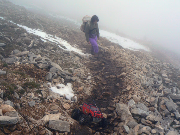 Por fin dejamos el bosque atrás, mis hijos ya se han adelantado y me esperan pacientemente unos metros adelante en la ladera. Hay que subirla. Se sigue una diagonal que termina al lado de la cresta, en donde aparece un poco de niebla. Es dura. Y no siempre hay camino. La parte sin sendero esta llena de pequeños peldaños naturales en la ladera, unos pueden subirse con el coche y otros no. a menudo hay que coger el coche con la mano y lanzarlo un par de palmos más arriba hasta encontrar parte más lisa. La parte con sendero esta compuesta por pequeñas piedras u tierra perdida como la que vemos en esta imagen, con una adherencia al límite pero suficiente para subir suavemente. Esta pendiente es larga y en algún cacho muy fuerte, pero impresiona más a la bajada. |