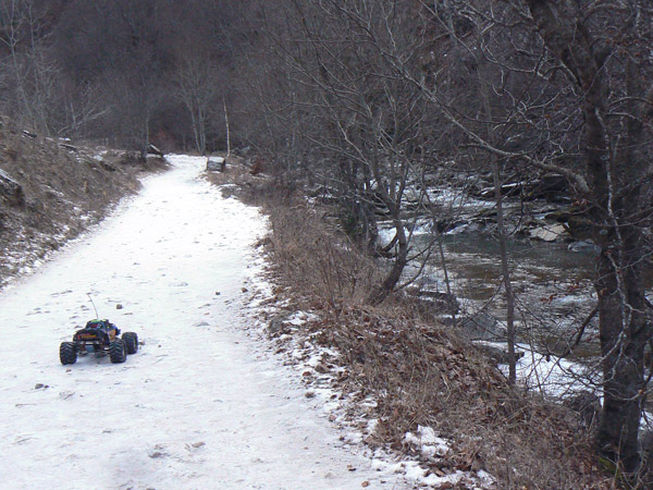 Regatas heladas cruzando el camino Todavía nos guarda el camino una agradable sorpresa antes de llegar a la entrada del valle. Varias regatas heladas, y esta vez no simples pasillos, cruzan el camino obligando a subir y bajar algunos metros en busca de un lugar de poca anchura que pueda pasarse fácilmente. No llevo crampons , no voy a arriesgar nada si no lo veo claro. Ya hace algunos años que decidí que ante una duda la opcion correcta es siempre la más segura. Exactamente todo lo contrario que pensaba unos años más atrás . Me apetecía pasar el Emaxx por esta regata. Parece que la goma que lleva agarra mejor que la de mis botas y algo de tracción, por poca inercia que tenga el Emaxx le permite subir ligerísimas pendientes como esta, que la hizo desde abajo tras un pequeño empujón . Desde luego que si no estoy yo abajo en zona segura no meto el coche por ahí, si le da por bajar patinando y no estoy para pararle hubiera caído hasta el fondo del valle y lecho del río.