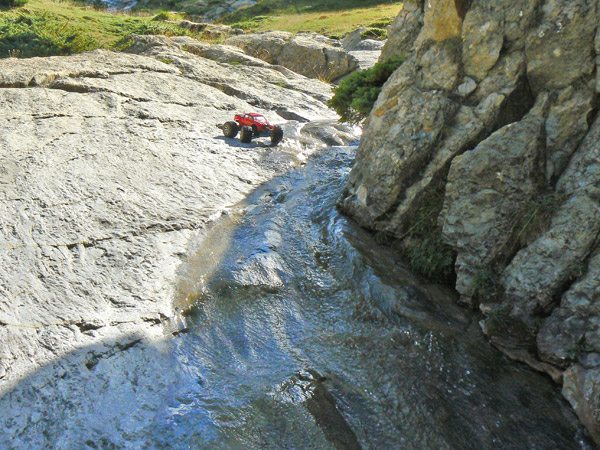 Para cuando tome esta foto la corriente ya se habia llevado el Emaxx aguas abajo unos veinte cenitmetros , afortunadamente escupiendolo hacia zona menos profunda y con mas adherencia. Je je je , casi me parecio oir gritar al conductor y al acompañante.