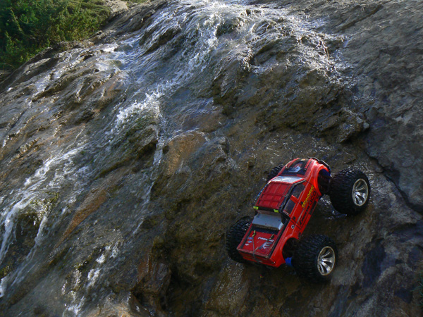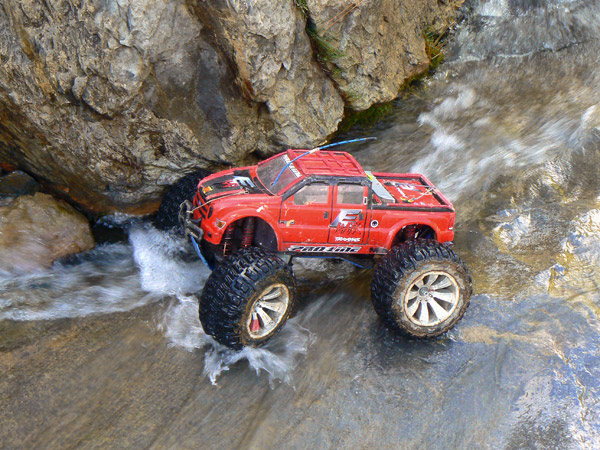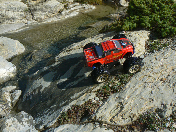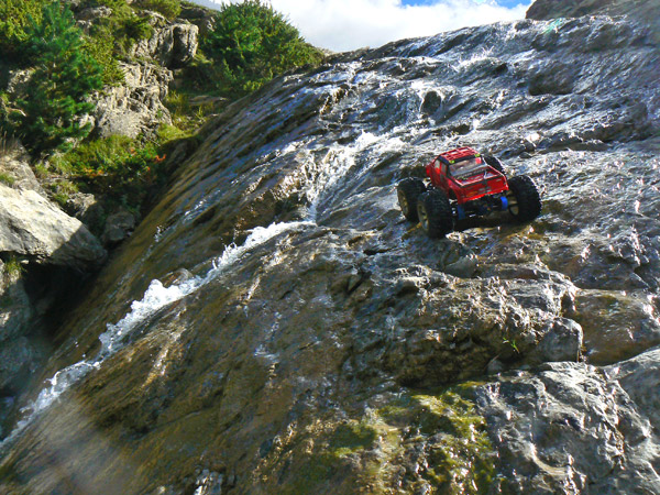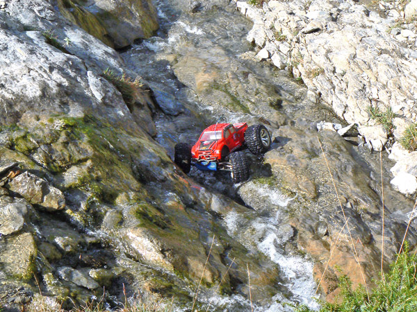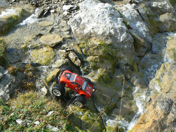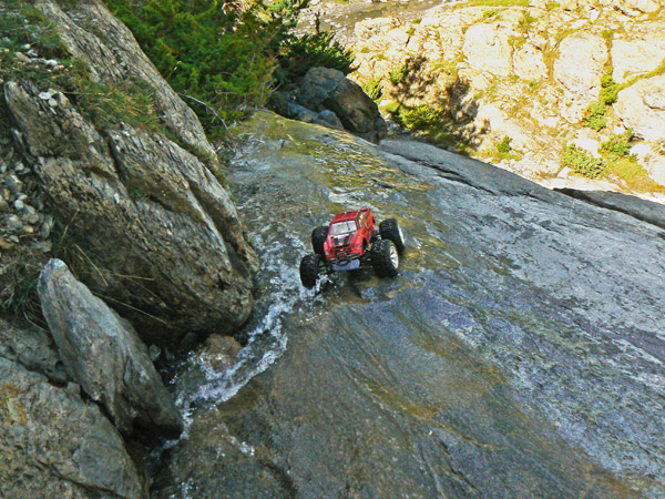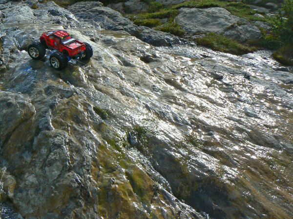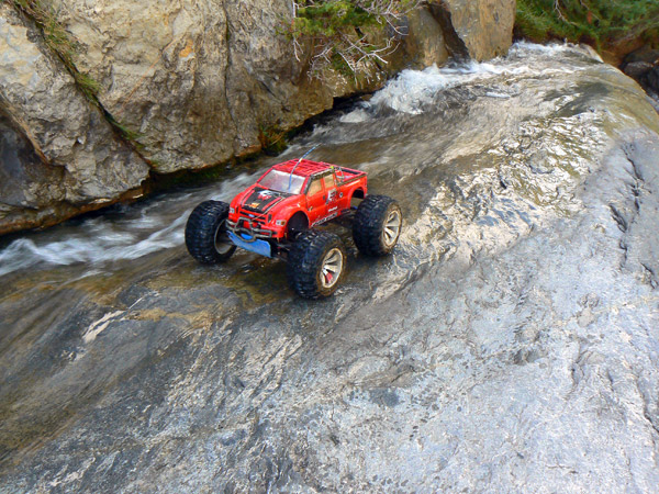 Una vez ha entrado agua en los neumaticos del coche de radio control ( llevan esponja, no aire como los de verdad) ya te da un poco igual pasar con agua hasta el eje o hasta el motor. No solo eso, juraria que en cada charco o poza voy a por más .