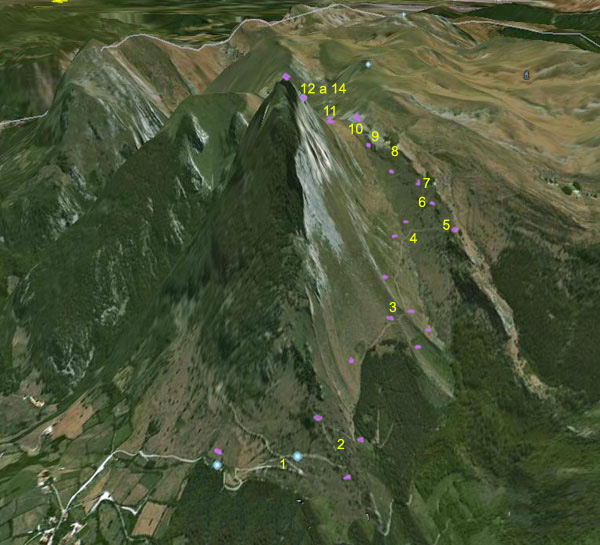 asciende hasta el collado y a la cima. Los números en amarillo