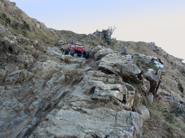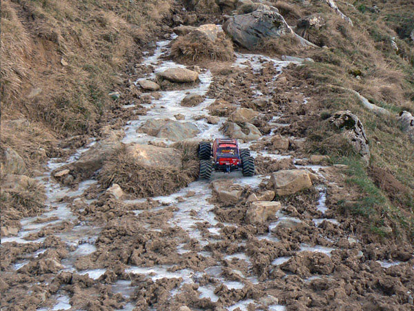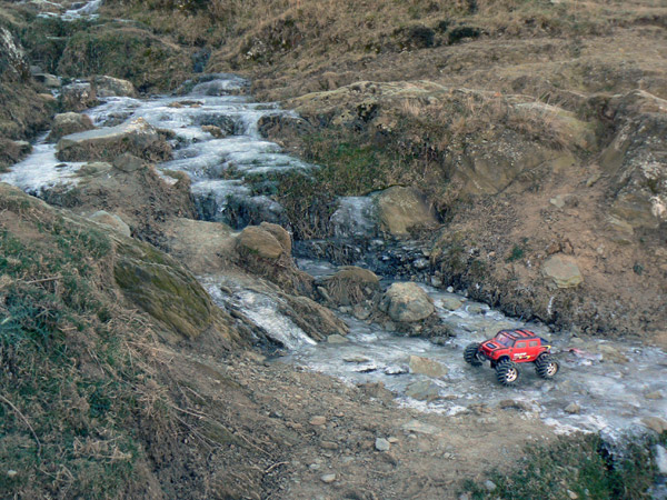 no resbalar sobre las pulidas piedras y agarrando al Emaxx con la otra.
